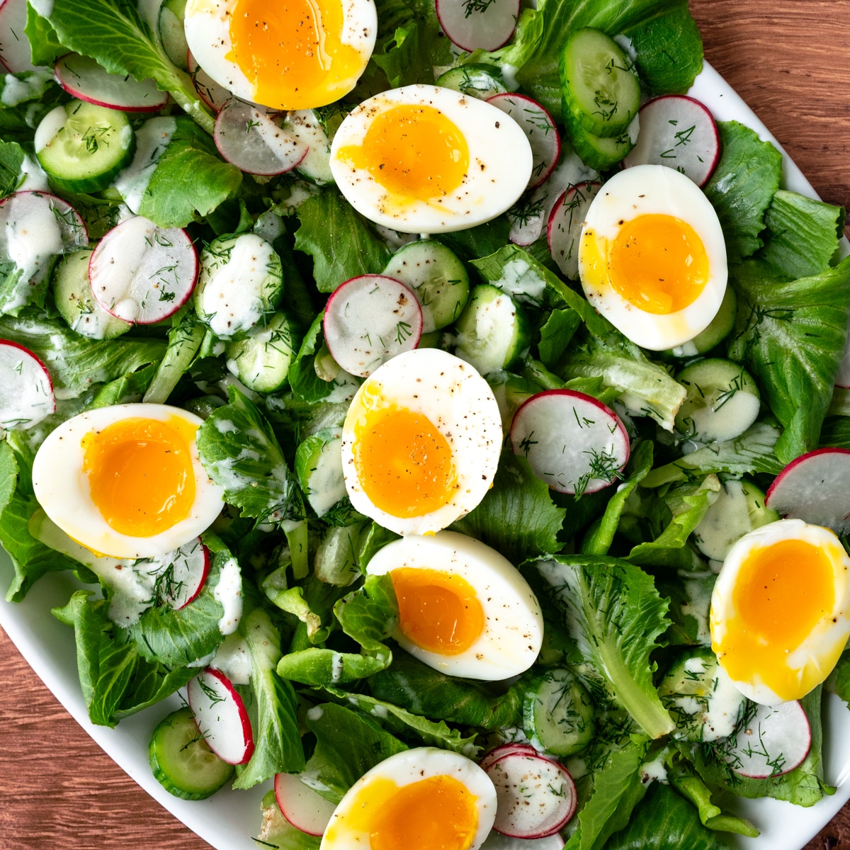 Assemble the Salad. Place the Little Leaf Farms Romaine Leaf Lettuce on a large serving plate. Evenly add the cucumber, radishes, and dill. Drizzle with the dressing, then top with the boiled eggs. Season with sea salt and pepper, if desired. Serve immediately and enjoy!